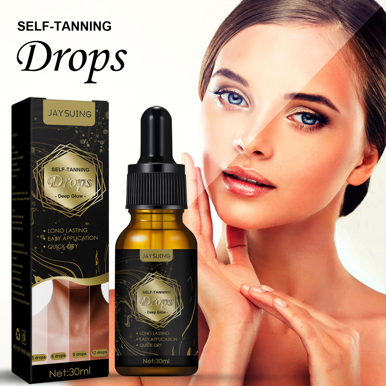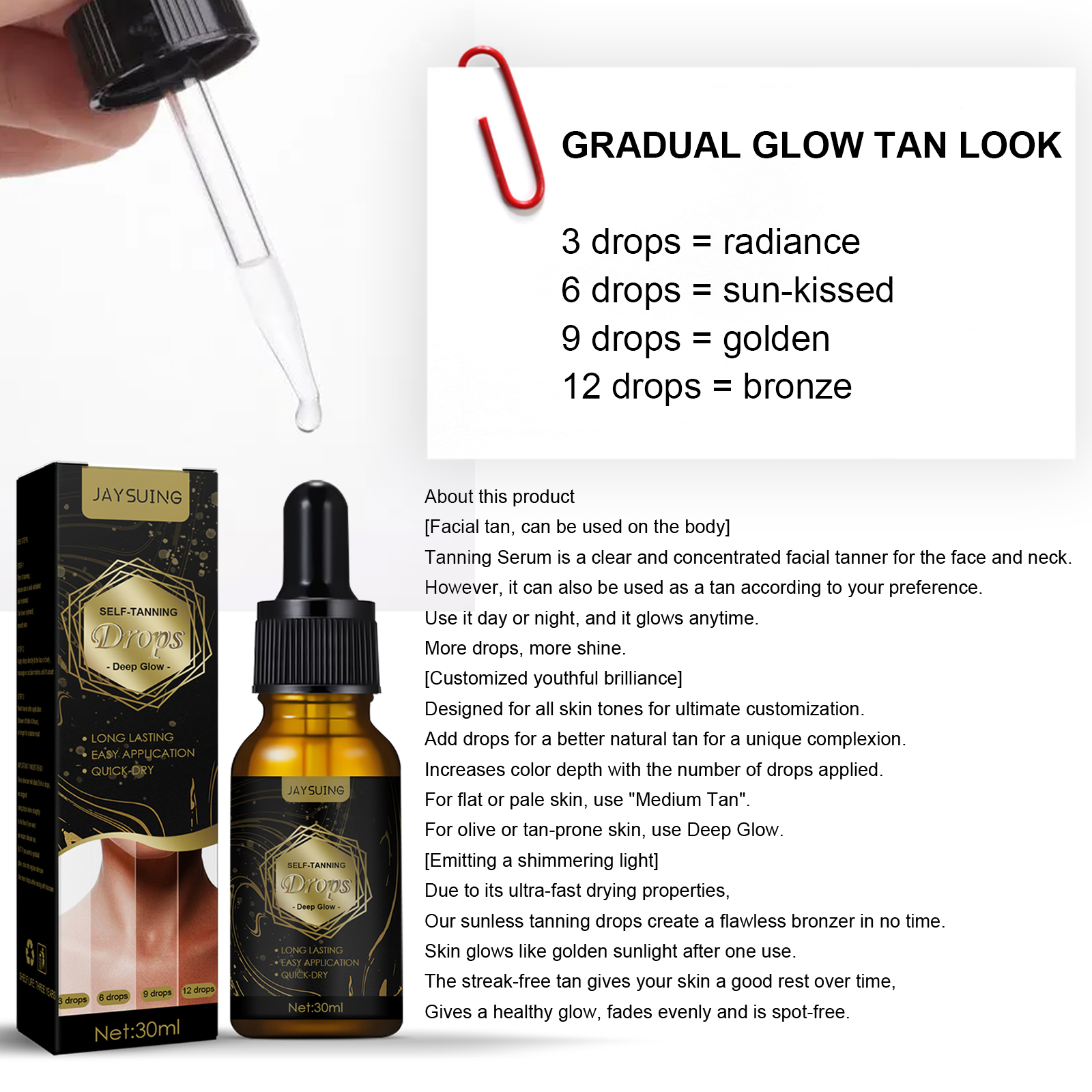 Our black serum contains chlorella extract, Indian chrysanthemum extract. Aloe vera leaf juice. It creates a flawless tan in a short amount of time. After one use, the skin glows like golden sunlight. Over time, a streak-free tan will give your skin a good rest, giving a healthy glow that fades evenly and is spotless. Its application is simple: before tanning, make sure the skin is fully exfoliated and moisturized, and the skin is hydrated and smooth; Apply the drops directly to the face or body and massage in circular motions until absorbed. Wash your hands after use. Rinse in the shower after 4-8 hours, or longer if the color is darker. Tanning Serum is a clear and concentrated facial tanning agent for the face and neck. It will shimmer at any time, after adding drops will get a better natural tan, create a unique skin tone, increase the color depth and number of drops applied, no bad smell, gradually fade over time.