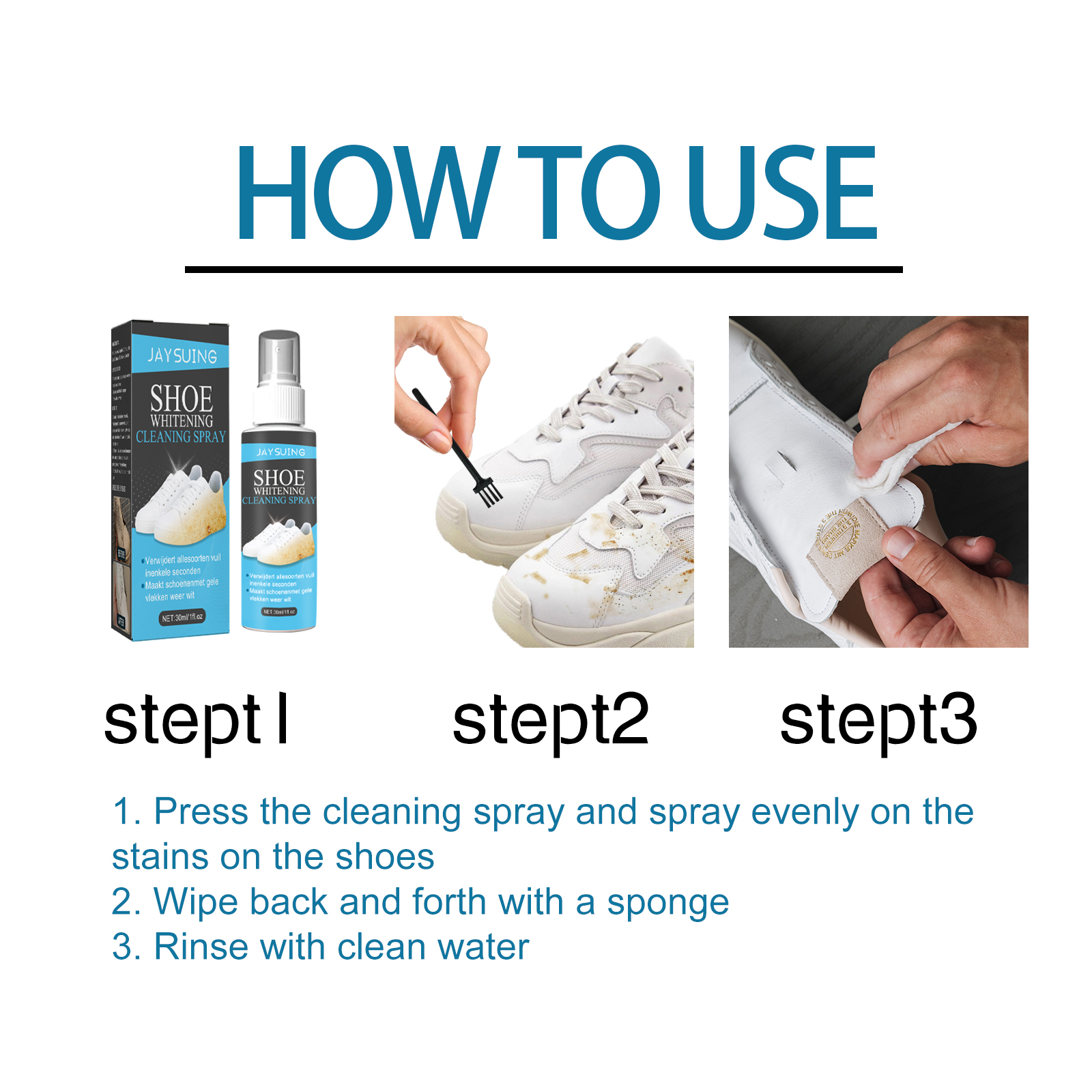 Our shoe brightening cleaning spray contains phenoxyethanol, lysozyme, turpentine. It can remove stubborn stains on the upper, the surfactant quickly melts and breaks down the stain and prevents dust. Its use method is very simple: press the cleaning sprayer, evenly spray on the stain on the shoe; Sponge back and forth; Rinse with clean water. Shoe Brightening Cleaning Spray powerful decontamination, no need to wash with water, clean and bright, remove all types of dirt in seconds, turn yellow spotted shoes white.